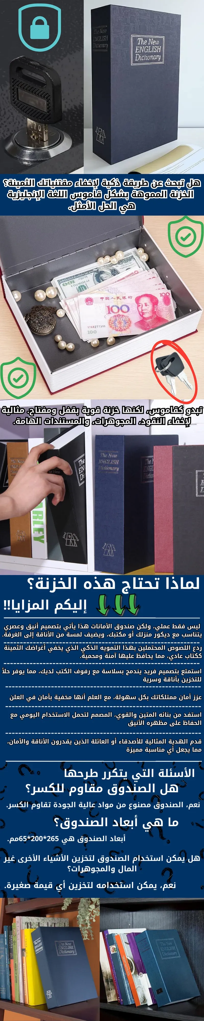 اكتشفوا المزيج المثالي من الأمان والأناقة مع كوفرينا على شكل كتاب يوفر طريقة أنيقة وخفية لإخفاء ممتلكاتك الثمينة في العلن. يندمج بسلاسة مع رفوف الكتب لديك، مما يردع اللصوص ويضيف لمسة من الأناقة إلى ديكورك. خفيف الوزن، متين، وقابل للتخصيص، هو الحل المثالي لأولئك الذين يقدّرون الأمان والرقي.